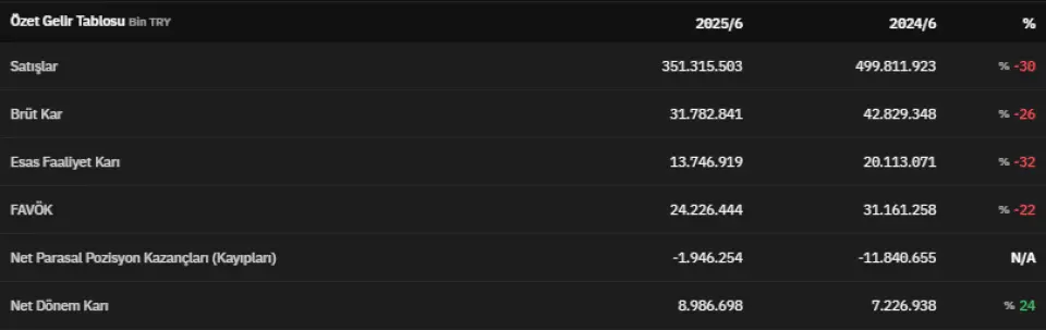 Şirket 2025 yılının ikinci çeyreğinde 351.315.503.000 TL satış gerçekleştirmiştir. 2024 yılının aynı dönemine oranla satış geliri %30 azalmıştır. 2024 yılının ikinci çeyreğinde satışlar 499.811.923.000 TL olarak kayıtlara geçmişti. 2025 yılının ikinci çeyreğinde brüt kar 31.782.841.000 TL olarak açıklanmıştır. 2024 yılının ikinci çeyreğinde ise bu veri 42.829.348.000 TL olarak açıklanmıştı.