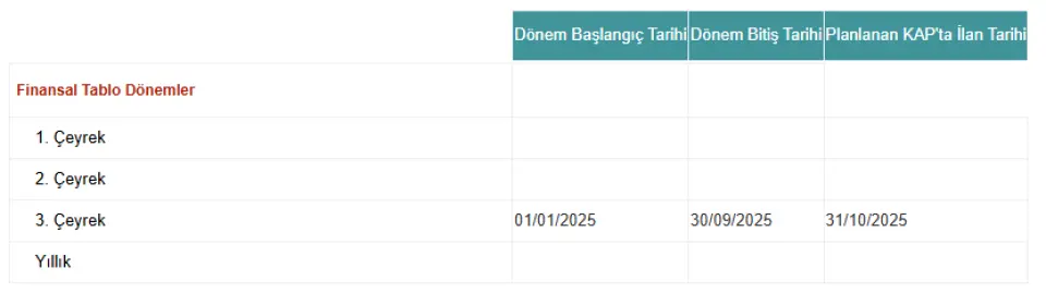 Şirket ilgili bildirimde, 01.01.2025 – 30.09.2025 hesap dönemine ilişkin finansal raporlarının, 31 Ekim 2025 tarihinde kamuya açıklanmasının planlandığını duyurdu.Bununla birlikte kurumsal politikalar gereği, finansal tabloların açıklanmasından önceki iki hafta süresince "sessiz dönem" uygulamasının yürütüleceği, bu dönemde kamuya açıklanmış bilgiler hariç, şirketin finansal durumu hakkında herhangi bir bilgi verilmeyeceği bildirildi. Bu kapsamda, analistler, yatırımcılar ve diğer sermaye piyasası katılımcılarının finansal durum ile ilgili toplantı taleplerinin kabul edilmeyeceği ve bu konulardaki sorularının cevaplanmayacağı aktarıldı.