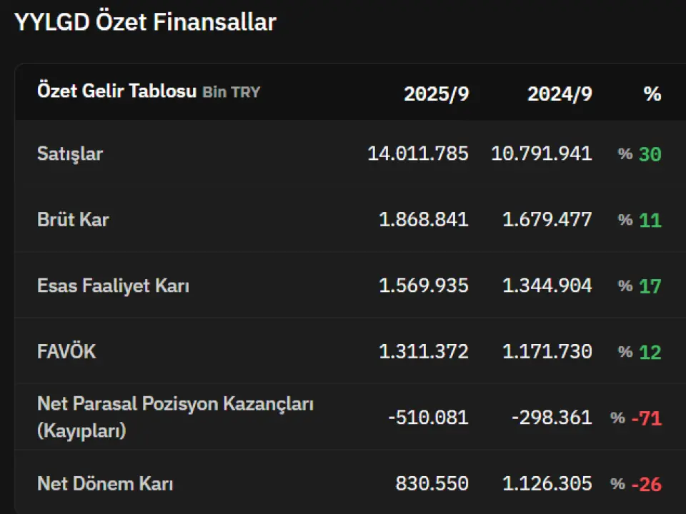 YYLGD bu yıl 3. çeyrekte karlılıkta %26 düşüş kaydetti. Şirket 830.550.000 TL kar açıkladı. Marbaş Menkul şirketin finansal yapısını değerlendirdi. Bu çeyrekte karlılıkta düşüş yaşayan şirketi, yatırım harcamaları devam ettiği için olumlu değerlendiren kurum, şirketin yatırım dönemine rağmen güçlü seyrettiğini açıkladı.