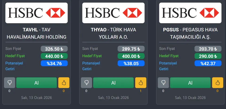HSBC, 13 Ocak 2026 tarihi itibarıyla Borsa İstanbul'da işlem gören üç şirket için hedef fiyat verdiğini açıkladı. Kurum tarafından paylaşılan hedeflerde TAV Havalimanları, Türk Hava Yolları ve Pegasus hisseleri için "Al" tavsiyesi verilirken, her üç hisse için de mevcut fiyatların üzerinde hedef değerler belirlendi.