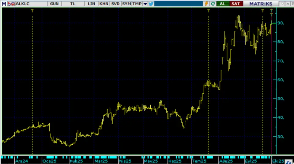 Bu arada ALKLC hissesi yükselen trende başladı ve zaman içinde hızlandı. Şirketin geri alımlara başladığı günlerde 35 Lira civarında işlem gören hisse, 25 Ağustos günü 93 Lira zirve fiyata kadar primlenerek %165 prim yapmış oldu.