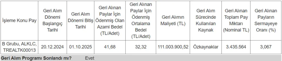 15.11.2024 tarihinde başlatılan program kapsamında bugüne kadar toplam 3.435.564 adet pay geri alınmış olup, ortalama alım fiyatı 32,32 TL, toplam işlem tutarı ise 111.003.900,52 TL olarak gerçekleşmiştir.