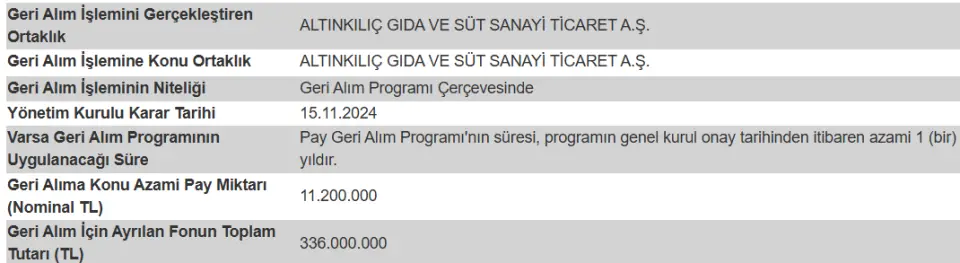 Altınkılıç Gıda ALKLC borsada değer kaybeden hissesine destek amacıyla geçtiğimiz yıl bir pay geri alım programı başlattı. Program için 336 milyon Liralık bir bütçe ayrıldı ve borsadan 11.200.000 lot hissenin geri alınması planlandı.