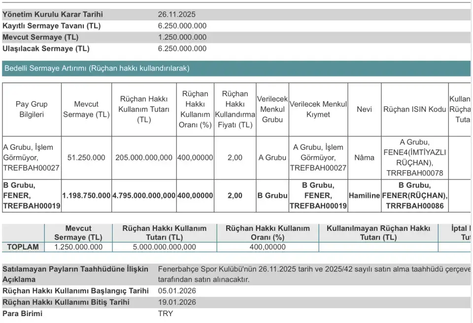 KAP Açıklaması."Şirketimiz yönetim kurulunun 118.000.000 TL olan sermayemizin 5.000.000 TL kayıtlı sermaye tavanı dahilinde kalmak ve tamamı geçmiş yıl kârlarından karşılanmak üzere 482.000.000 TL artış ile 600.000.000 TL'ye çıkartılmasına ilişkin 30.12.2025 tarihli kararı aynı tarihte Kamuyu Aydınlatma Platformu'nda ilan edilmişti. Şirketimiz iç kaynaklardan sermaye arttırımı kapsamında mevzuat uyarınca gereken izinleri teminen Sermaye Piyasası Kurulu, Bankacılık Düzenleme ve Denetleme Kurumu ve T.C. Ticaret Bakanlığı'na başvuru gerçekleştirmiştir."