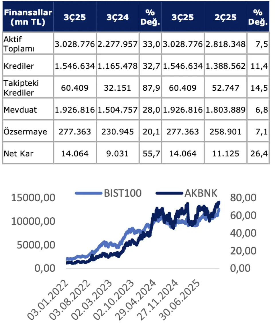 AKBNK'ın net kârı 2025/09’da bir önceki yılın aynı dönemine oranla %17 oranında artışla 38,9 milyar TL olmuştu. 3Ç25’te net kâr 14,06 milyar TL ile çeyreksel bazda %26 oranında artmıştı. Anadolu Yatırım, bankanın bet faiz gelirleri için "2025/09 itibarıyla 65,05mlr TL seviyesinde gerçekleşmiş olup, önceki yılın aynı dönemine göre %34 artış göstermiştir. Net çeyrekte ise 28,6mlr TL ile pozitif bir tablo oluşturmuştur." değerlendirmesinde bulundu.