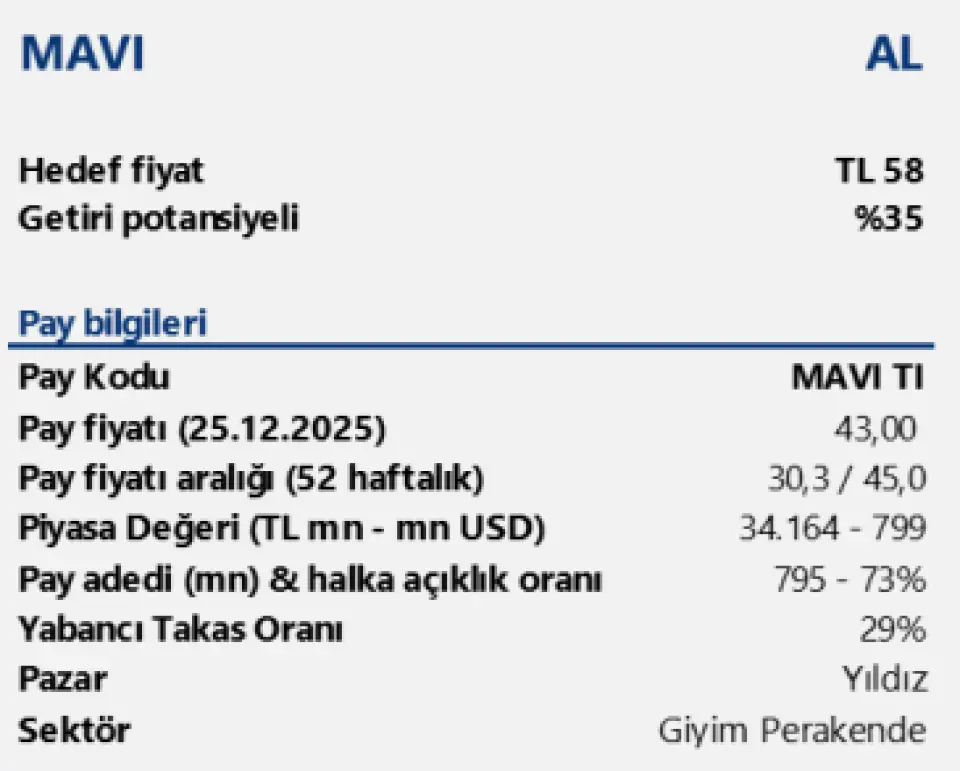Mavi Giyim için 12 aylık hedef fiyatımızı 58,00 TL seviyesinde koruyor ve “AL” tavsiyemizi sürdürüyoruz. Güçlü marka konumu, esnek fiyatlama kabiliyeti ve yüksek operasyonel disiplini sayesinde Mavi’yi, zorlu makro koşullarda dahi marjlarını koruyabilen ve 2026 itibarıyla normalleşen finansal koşullardan net şekilde faydalanabilecek perakende oyuncuları arasında değerlendiriyoruz. Bu çerçevede şirket, Model Portföyümüzdeki yerini korumaya devam etmektedir.