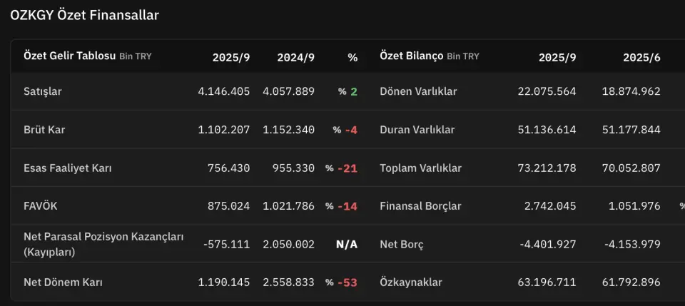 - "Özak GYO, 1 Şubat 2008'de kurulmuş ve 03.06.2009 tarihinde GYO’ya dönüşümü gerçekleşmiştir. Şirketin gelirleri; ağırlıklı olarak gayrimenkulgeliştirme, ticari işletmelerden elde dilen kira gelirleri ve turizm gelirlerinden oluşmaktadır. 9A/2025 döneminin solo finansal rakamlarına göre Şirketin toplam hasılatı 2.276 milyon TL olarak gerçekleşmiştir. İlk dokuz aylık dönemde 693 milyon TL FAVÖK ve 1.383 milyon TL net kar eldeedilmiştir. FAVÖK marjı %30,47 seviyesinde, net kar marjı ise %60,76 seviyesinde gerçekleşmiştir."