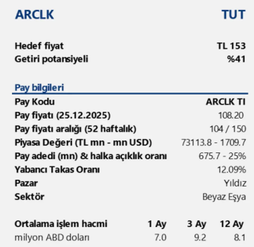 Arçelik için 12 aylık hedef fiyatımızı hisse başına 170 TL’den 153 TL’ye revize ediyor ve hisse için TUT tavsiyemizi sürdürmeye devam ediyoruz. Hedef fiyat revizyonumuz; zayıf seyreden talep görünümü ve marj toparlanmasının beklenenden daha kademeli gerçekleşeceğine yönelik varsayımlarımızdan kaynaklanmaktadır. Şirketin küresel operasyonlarını genişletmeye yönelik stratejik adımları, ölçek ekonomilerinin orta vadede daha belirgin hale gelmesi ve operasyonel verimlilik odaklı yeniden yapılandırma süreci, mevcut değerleme seviyelerinde hisseye ilişkin risk/getiri dengesini desteklemektedir. 2026T dönemi tahminlerimizde şirket, 89,7x F/K ve 4,9x FD/FAVÖK çarpanlarıyla işlem görmektedir.