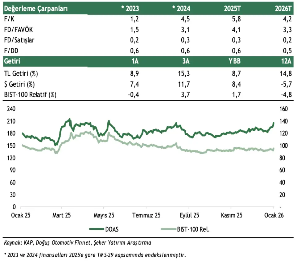 - "Doğuş Otomotiv, 2026T 3.3x FD/FAVÖK ve 2026T F/K 4.2x rasyoları ile işlem görmektedir. Şirket’in toplam araç satışları Škoda dahil 12A25’te 206.6bin adete ulaşmış (yıllık +%12,2), toplam pazar payı %15,1’e yükselmiştir (PC+LCV+HCV). 2026’da; Škoda dahil toplam PC satışlarının düşük-yatay artış göstereceğini, LCV segmentinde rekabet yoğunluğu ve baz etkisi nedeniyle büyüme hızının yavaşlayabileceğini, ağır ticari araçlarda ise pazar şartlarına bağlı sınırlı düşüş varsayıyoruz."