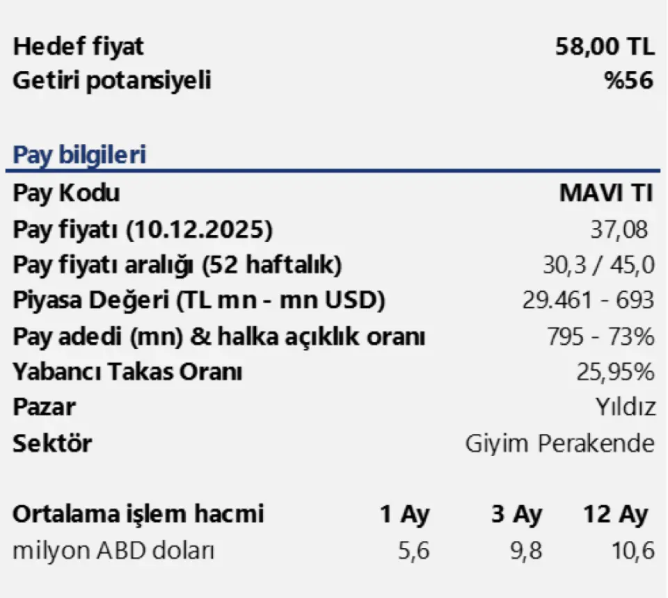 %56 getiri potansiyeli! MAVI hissesi için hedef fiyat verildi. Aracı kurum, Mavi Giyim'in 2025 yılı 3. çeyrek finansallarını analiz edildi. Hisse tavsiyesi de verildi.