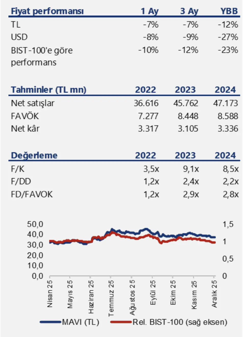 - "Son 12 ayda MAVI hissesindeki zayıf performans; azalan satın alma gücü, fiyatlamayı sınırlı destekleyen düşük giyim enflasyonu ve daralan marjlarla zayıflayan finansalların etkisiyle şekillendi. Buna karşın tahminlerimiz, marjlarda kademeli toparlanma ve 2025 sonrası dönemde faiz oranlarında olası gevşeme döngüsünü yansıtıyor."