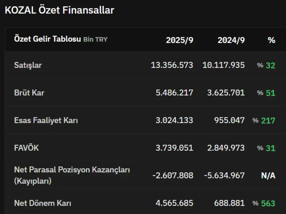Öte yandan Koza Altın, en son duyurduğu 2025 yılı 3. çeyrek bilançosunda kar orannı önceki senenin aynı dönemine oranla %563 artıdı ve 4.565.685.000 TL kar rakamı duyurdu. Şirketin önceki yıl 3. çeyrek karı sadece 688.881.000 TL olmuştu. Karlılıkta görülen devasa artış, hisseye yatırımc yapanları da umutlandırdı.