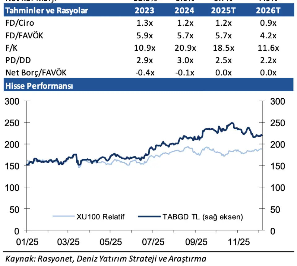 - "Yıl sonu ve gelecek yıla ilişkin beklentilerimiz ışığında, makro tahminlerimizdeki değişiklik ve İNA modelimizi ileri taşımamız neticesinde TABGD için 12 aylık hedef fiyatımızı güncelliyoruz."