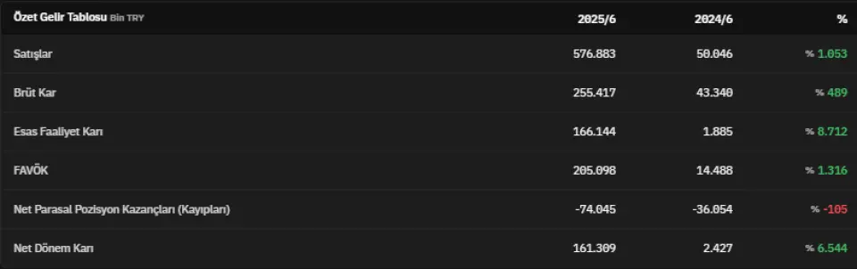 FAVÖK 2025 yılının ikinci çeyreğinde 205.098.000 TL olarak açıklanmıştır. Net dönem kârı ise 161.309.000 TL olarak kaydedildi. İlgili veri 2024 yılının ikinci çeyreğinde 2.427.000 TL olarak açıklanmıştı. Böylece net dönem karı, 2025 yılının ikinci çeyreğinde %6.544 artmış oldu.