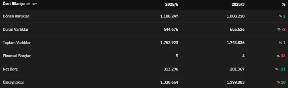 Dönen varlıklar 2025 yılının ikinci çeyreğinde 1.108.247.000 TL olmuştur. 2025 yılının ikinci çeyreğinde 644.676.000 TL olarak açıklanan duran varlıklar, 2025 yılının ilk çeyreğinde 655.626.000 TL olarak açıklanmıştı.Finansal borçlar 2025 yılının ikinci çeyreğinde 5.000 TL olarak açıklandı. 2025 yılının ikinci çeyreğinde net borç -313.296.000 TL olarak açıklandı. Özkaynaklar 2025 yılının ikinci çeyreğinde 1.320.654.000 TL olarak kayıtlara geçti. 2025 yılının ilk çeyreğinde 1.199.083.000 TL olarak açıklanan özkaynaklar, 2025 yılının ikinci çeyreğinde %10 artmış oldu.
