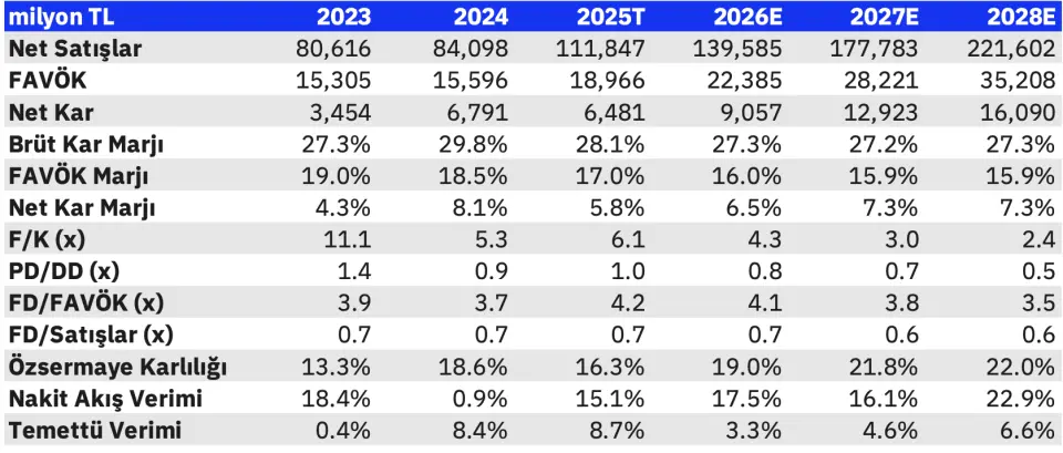 - "Gerçeğe uygun değer tahmini, hisse başına hedef fiyatımızı güncelledik. Hisse, 2025T için 3,9x FD/FAVÖK ve 5,1x F/K ile makul seviyelerde işlem görmektedir. Önümüzdeki birkaç yıl içinde, şirketin yüksek tek haneli enflasyon varsayımıyla orta %20'lerde özvarlık karlılığı elde edebileceğini düşünüyoruz. 2Y25’te FAVÇÖK ve nakit akışında beklenen iyileşmenin, son 1 yıllık yaklaşık %30'luk düşük performansın ardından hisse için orta vadeli bir katalizör olabileceğini düşünüyoruz.