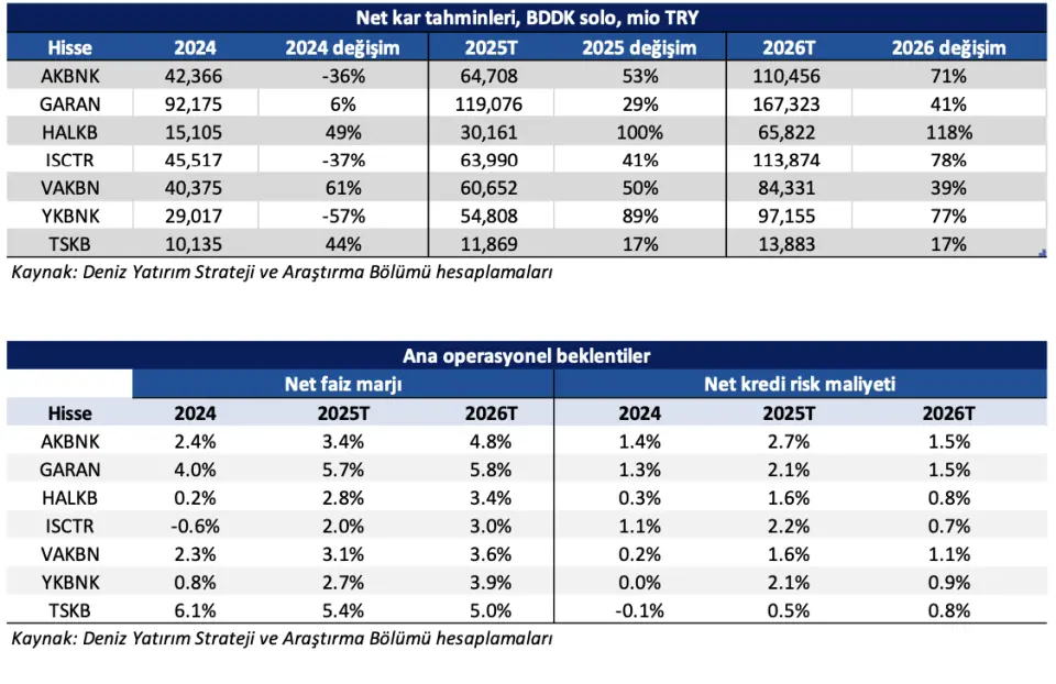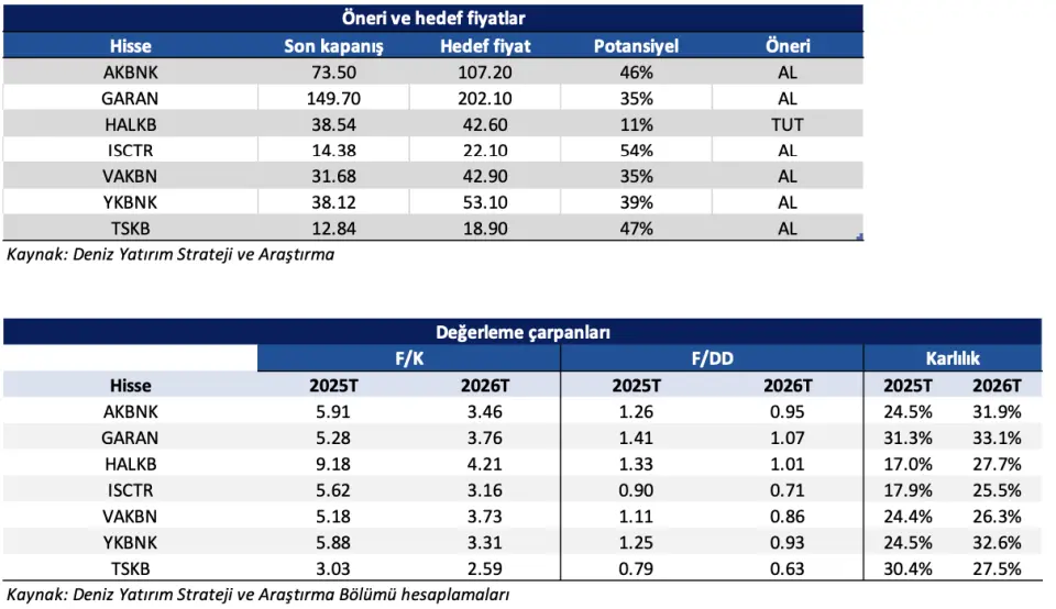 Aracı kurum Deniz Yatırım, 2026 yılı strateji raporunu yayımladı. Aracı kurum bankacılık hisselerine ilişkin değerlendirmesini paylaştı. Deniz Yatırım, 7 banka hissesi için 12 aylık hedef fiyat ve hisse tavsiyesini duyurdu.