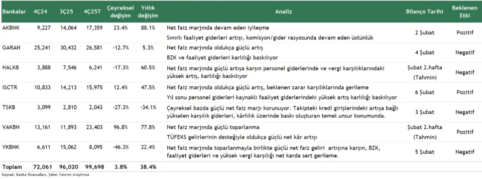 7 bankanın sadece 3'ünün 4Ç25'te POZİTİF sonuçlar paylaşması bekleniyor. Şeker Yatırım, bankalar için 4. çeyreğin nasıl geçtiğine yönelik analizlerde bulundu.