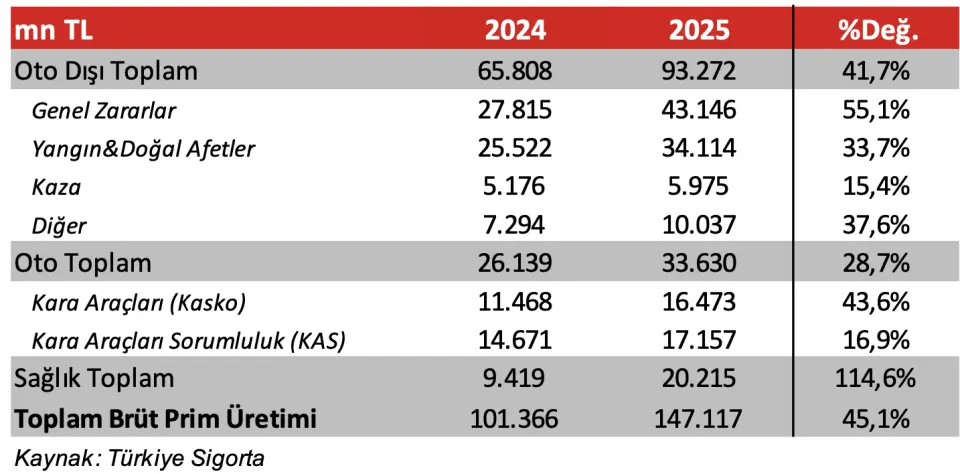 - "Şirket’in Prim Üretimi bu yıl 147 milyar TL’ye ulaştı... Türkiye Sigorta’nın 2025 yılında prim üretimi yıllık bazda %45 artarak 147 milyar TL’ye ulaşmıştır. Sağlık branşı %115 oranında artarak büyümenin ana sürükleyicisi olmuştur. Bu alandaki teknik kar da %45 oranında artış gösterirken, net bileşik oran sektördeki gibi kurumsal sağlık sigortası kaynaklı eşik seviyenin üzerinde, %113 olarak gerçekleşmiştir. Bireysel sağlık ürününün hasar oranının %100’ün altında olduğu belirtilmiştir. Şirket sağlıkta hedeflerinden önce 3 yıl içinde üçüncü sıraya ulaşmıştır. Önümüzdeki dönemde modüler tamamlayıcı sağlık ürünleri ve risk bazlı fiyatlama yaklaşımıyla daha geniş bir müşteri kitlesinin hedeflendiği de ifade edilmiştir. Ayrıca Genel zararlarda prim üretimi yıllık %55,1 büyürken, Yangın ve Doğal Afetler branşındaki artış %33,7 seviyesinde gerçekleşmiştir. Oto-dışı branşlar son çeyrekte toplam brüt prim üretiminin %63,4’ünü oluşturmuş (2024: %57,6), portföy karmasındaki iyileşmeye işaret etmiştir. Sağlık branşındaki pay ise yaklaşık 4,5 puan artarak %13,7’ye yükselmiştir. Son olarak, Şirket’in prim üretiminde karlılığı yüksek Banka kanalı %44 pay ile ilk sırada yer almıştır."