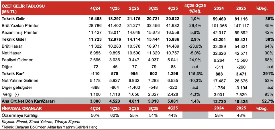 - "Dördüncü çeyrek karı sonrasında Şirket'in 2025'teki net dönem karı yıllık bazda %52,7 oranında artarak 19.425mn TL'ye çıkmıştır. Sermaye yeterliliği %215 ile yasal temettü dağıtım sınırlarının üzerinde açıklanırken, bileşik rasyo %97 seviyesinde gerçekleşerek eşik seviyenin altında kalmayı başarmıştır. Türkiye Sigorta, brüt prim üretiminde %14 ile pazar liderliğini korumuştur."