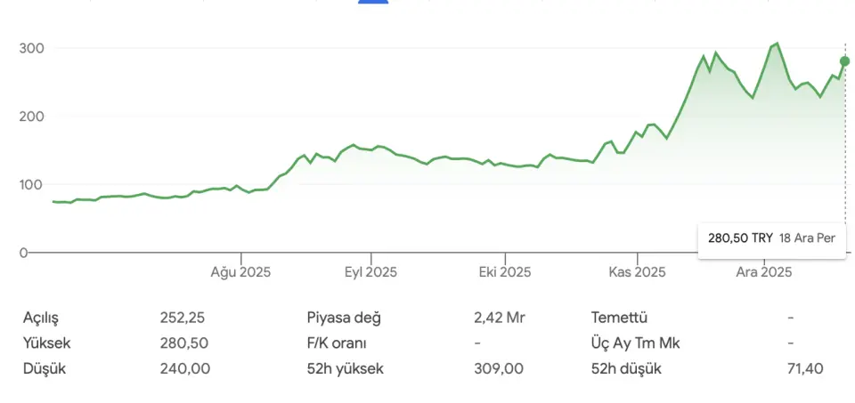 Son 6 ayda ise hissedeki hareketler daha fazla dikkat çekti. 18 Haziran 2025'te 74,65 TL olan SKYLP, 3 Aralık 2025'te de 307 TL'lere kadar yükselmişti.