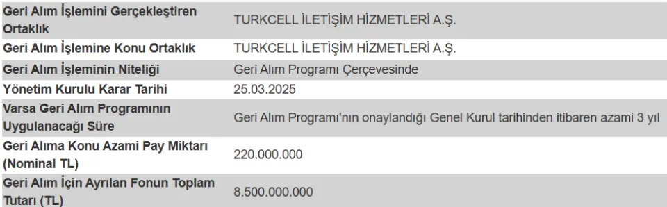 Şirker toplam 220.000.000 lot hissesini borsadan geri almayı planladı ve bu alış işlemi için de 8.500.000.000 TL bütçe şirket kasasından ayırıldı.