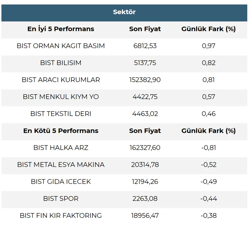 Sektör görünümlerinde ilk yarıda genel olarak pozitif seyrin hakim olduğu görülmektedir. En iyi performans sergileyen sektör(ler) Orman Kağıt Basım, Bilişim ve Aracı Kurumlar iken baskı görenlerde Halka Arz, Metal Eşya Makina ve Gıda İçecek dikkat çekmektedir.
