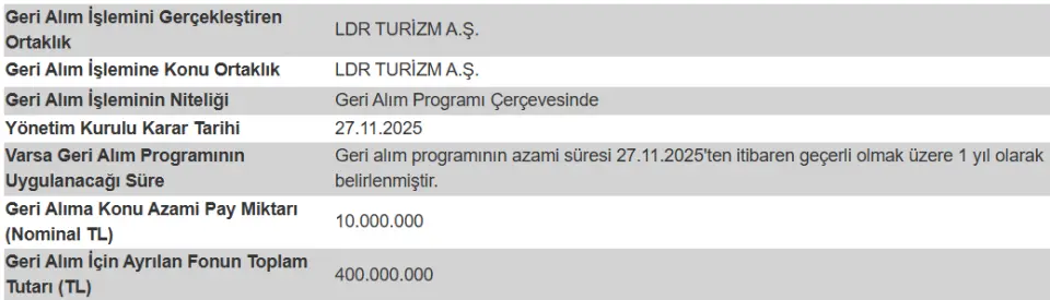 94 Liradan 41 Liraya 7 Taban! 400 Milyon Liralık Pay Geri Alım Hisseyi Kurtarır mı? Borsanın son 2 haftadır en çok konuşulan hissesi LDR Turizm LIDER! Hisse yatırımcısı son 2 haftada %60 a yakın para kaybetti. Hisse 7 gün taban taban geri geldi ve 94,30 TL fiyattan 41,70 TL fiyata kadar düştü.