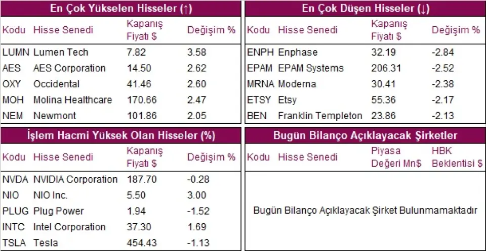 Fed tutanaklarının ardından dünkü işlemlerde seans sonu gelen satışların etkisiyle majör ABD endeksleri günü %0,1-%0,2 arası düşüşle noktaladı. Sektörel bazda %1,0 yükselen S&P 500 Enerji Sektörü Endeksi günün en fazla değer kazananı olurken Tesla (TSLA) hisselerindeki düşüşün etkisiyle %1,2 gerileyen S&P 500 İsteğe Bağlı Tüketim Sektörü Endeksi ise günün en fazla kaybettireni oldu.