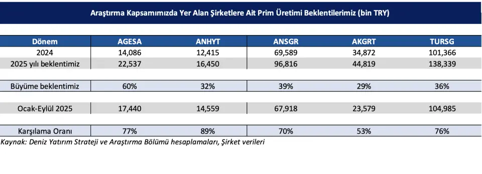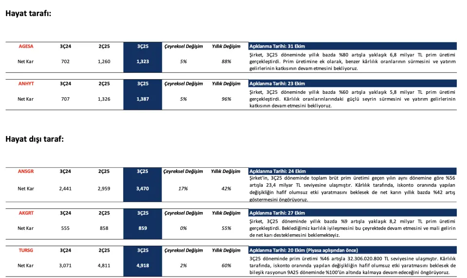 - "Eylül 2025 raporumuzda, gerçekleşen prim üretimi rakamlarının büyümelerine yer vermiştik. Bu verilere ek olarak, mevcut raporumuz ile, 3Ç25 dönemine ait hayat ve hayat dışı sigorta sektöründeki şirketlere yönelik beklentilerimizi ilerleyen sayfalarda bulabilirsiniz."