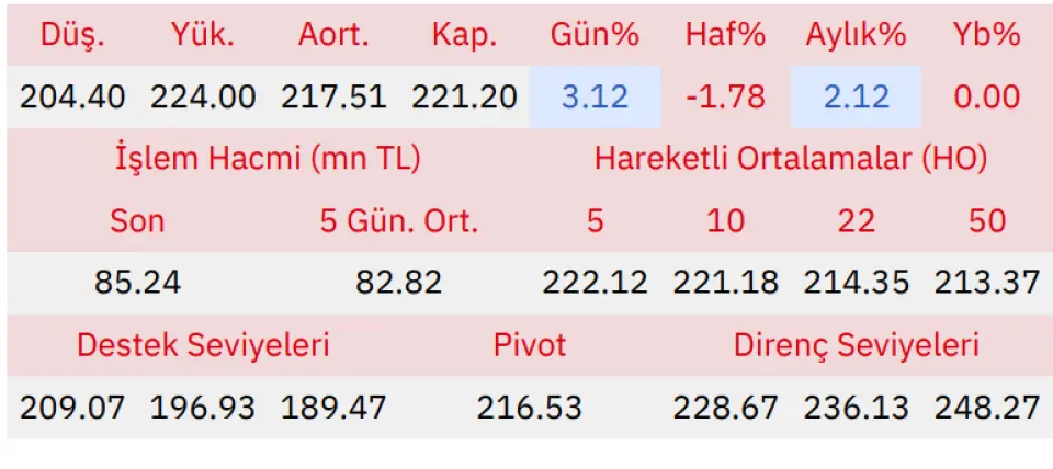 Gün içinde en düşük 204.40 en yüksek 224.00 seviyesini gören Agesa Hayat ve Emeklilik hissesinin günü %3.12 kazançla tamamladığı gözlenmektedir. Pivot seviye 216.53 seviyesinden geçmekte olup, aşağı yönlü hareketlerde birinci destek 209.07, ikinci destek ise 196.93 seviyesinden geçmektedir. Dirençler ise sırasıyla 228.67, 236.13 seviyelerinden geçmektedir. Bu aşamada endeksin 5 günlük HO seviyesinin %0.41 altında, 22 günlük HO seviyesinin ise %3.20 üstünde hareket ettiği dikkat çekmektedir. Son gün işlem hacmi ise bu aşamada 5 günlük ortalama işlem hacminin % 2.91 üstünde gerçekleşmiştir.