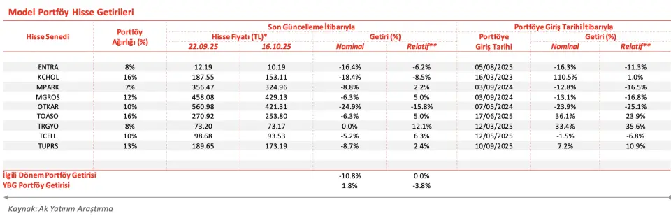 - "Model portföy değişikliğin ardından performansımız gösterge endeksine paralel geldi. 22 Eylül 2025 tarihinde Mavi Giyim (MAVI) hissesini model portföyden çıkarma güncellememizden beri, hisse senedi öneri listemiz %10,8 değer kaybetti. Bu süreçte BIST-100 toplam getiri endeksinin değer kaybı da aynı oldu ve böylece model portföy getirimiz bu dönemde gösterge endeksine paralel hareket etti. Portföy tavsiyelerimizin yılbaşına oranla getirisi de %1,8’e geriledi ve gösterge BIST- 100 toplam getiri endeksinin %3,8 gerisinde kaldı."