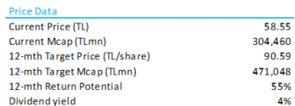 12 aylık hedef fiyat 90,59 TL/hisse olup, %59 getiri potansiyeli ve %4 temettü verimi içeriyor.