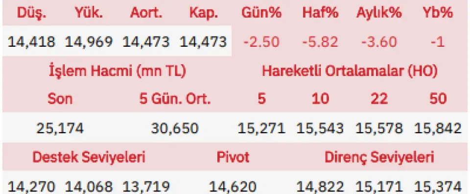 BIST BANKA endeksinde geçtiğimiz gün düşüş gördük, günü yüzde 2.5 düşüşle 14473 puandan kapattık. Gün içinde en düşük 14418 en yüksek 14969 seviyelerini gördük ve 14473 puandan kapattık. Destek ve direnç olarak 14270 ve 14822 seviyelerini takip edeceğiz. Endeks son kapanışıyla, 20 günlük ortalamanın altında yer alırken 200 günlük ortalamasının da altında hareketine devam ediyor.