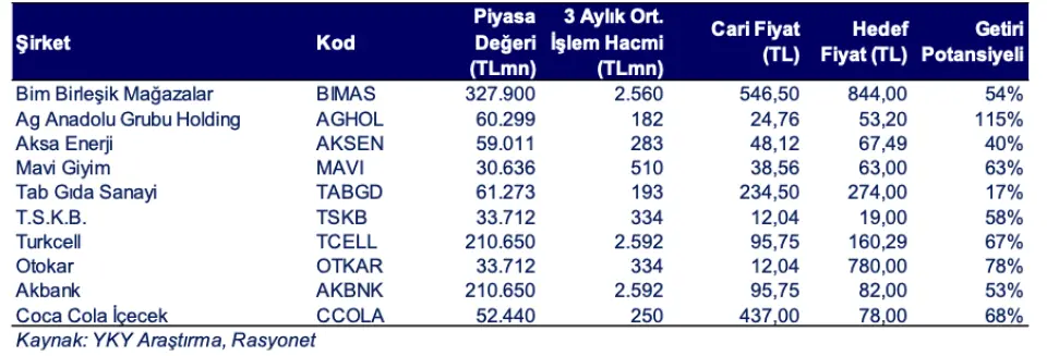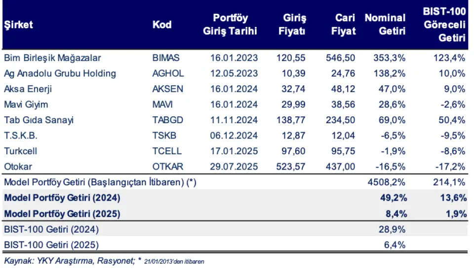 Borsa İstanbul'un aracı kurumu Yapı Kredi Yatırım, model portföy güncellemesi yaptığı bilgisini yatırımcılar ile paylaştı. Yapı Kredi Yatırım yaptığı güncellemede Akbank’ı (AKBNK) ve Coca-Cola İçecek’i (CCOLA) portföye dahil etti. Aracı kurum, hisselere yönelik değerlendirmesini yayımladı. Yapı Kredi, AKBNK ve CCOLA hisseleri için hedef fiyat ve hisse tavsiyesini de duyurdu.