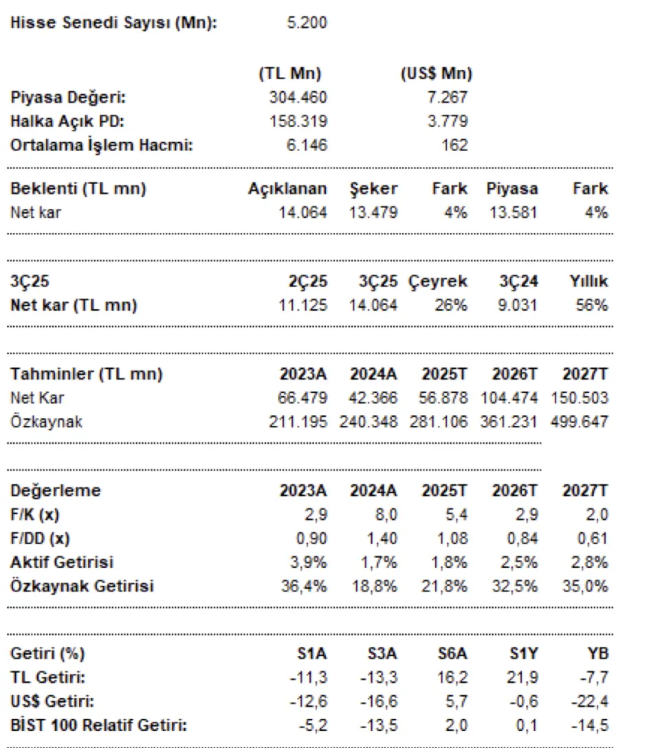 - "Duyurulan 3. çeyrek finansallarını, beklentinin hafif üzerinde gerçekleşen net kar, pazar payı kazanımları ve sürdürülen maliyet disiplini çerçevesinde “Pozitif” değerlendiriyoruz. 2025- 2026 net kar tahminlerimizde yaptığımız yukarı yönlü revizyonlar sonucunda hedef fiyatımızı güncelliyoruz."