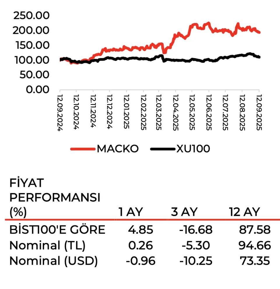 - "2025 yılı 2.çeyrekte Maçkolik, 263,96 milyon TL hasılat, 134,95 milyon TL FAVÖK, 88,48 milyon TL net kar ile öngörümüzün bir tık üstünde sonuçlar paylaştı."