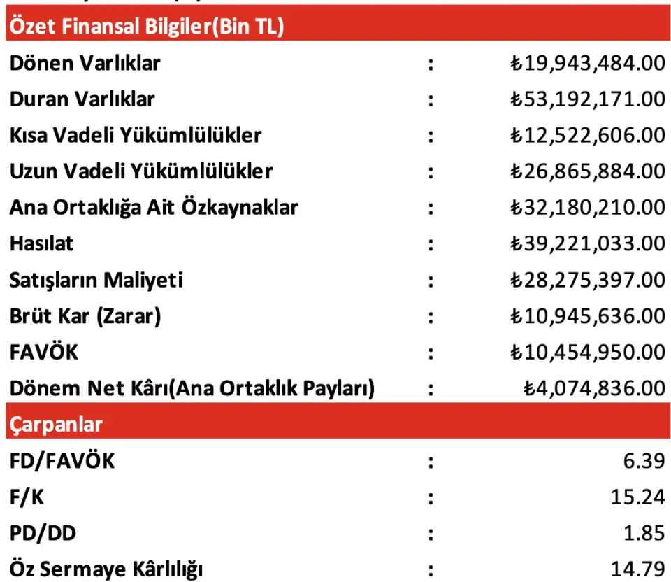 - "Cari dönemde, şirketin Net Yatırım Faaliyet Gelirleri; ‘’Pazarlıklı Satın Alım Sonucu Oluşan Kazançlar’’ alt kalemindeki sert(1,90 Milyar TL’lik) azalışın etkisiyle, 1,89 Milyar TL tutarında gerilemiş ve 414,0 Milyon TL civarında gerçekleşmiştir. Net Finansman Giderleri ise; ‘’Çeşitli FaizGiderleri’’’nin etkisiyle, senelik bazda 589,5 Milyon TL artmış ve şirket finansallarında 3,20 Milyar TL olarak yer almıştır. Cari dönem finansallarına 1,88 Milyar TL civarında yer bulan Vergi Gideri ile TMS 29 enflasyon düzeltmesi uygulamasından kaynaklı olarak 1,69 Milyar TL olarak kaydedilen Parasal Kazanç rakamları; sırasıyla 61,5 Milyon TL ve 192,4 Milyon TL tutarlarında iyileşmiştir."
