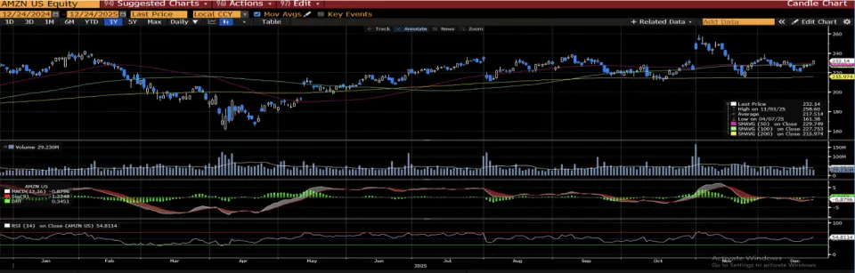 Teknik açıdan, hisse 50, 100 ve 200 günlük hareketli ortalamalarının üzerinde işlem görerek güçlü bir momentum sergiliyor ve genel trendin yukarı yönlü olduğunu gösteriyor. RSI (14) değeri 54,81 ile nötr bölgeden biraz daha yüksek, bu da hisse için daha fazla yükselme potansiyeli olduğuna işaret ediyor. Ancak MACD ve Signal göstergelerinin negatif olması, kısa vadeli düzeltme riski taşıyor. Şu an için en yakın destek seviyeleri 230,55 $ ve 228,75 $, direnç seviyeleri ise 234,15 $ ve 236,15 $ seviyelerinde. Piyasa değeri 2,476 trilyon $ olan Amazon, güçlü bir konumda ve analistlerin %96,5'i hisseyi "al" önerisiyle değerlendiriyor.