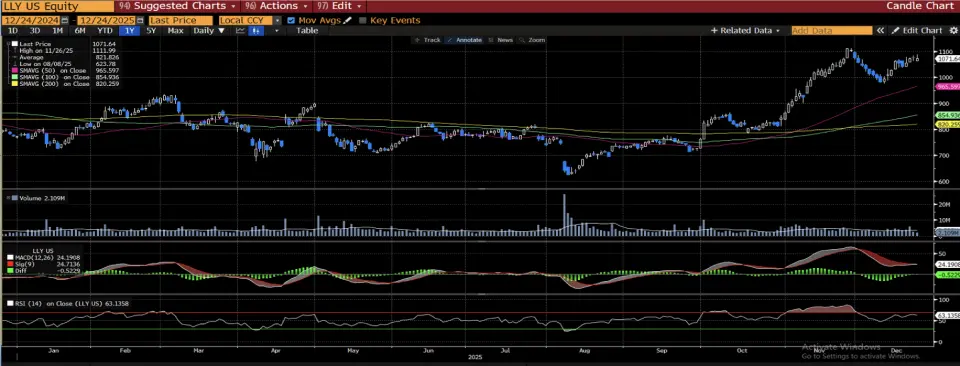 Eli Lilly and Company (LLY) hissesi, dün 1.071,64 $ seviyesinde işlem gördü ve zirve fiyatı olan 1.111,99 $'a yaklaşık %4 uzaklıkta bulunuyor. Hisse, 50, 100 ve 200 günlük hareketli ortalamalarının üzerinde işlem görerek güçlü bir teknik momentum sergiliyor; RSI (14) değeri 63,13 ile sağlıklı bir yükseliş potansiyeline işaret ederken, MACD (12,26) ve Signal (9) değerlerinin pozitif olması kısa vadeli alım momentumunu destekliyor.