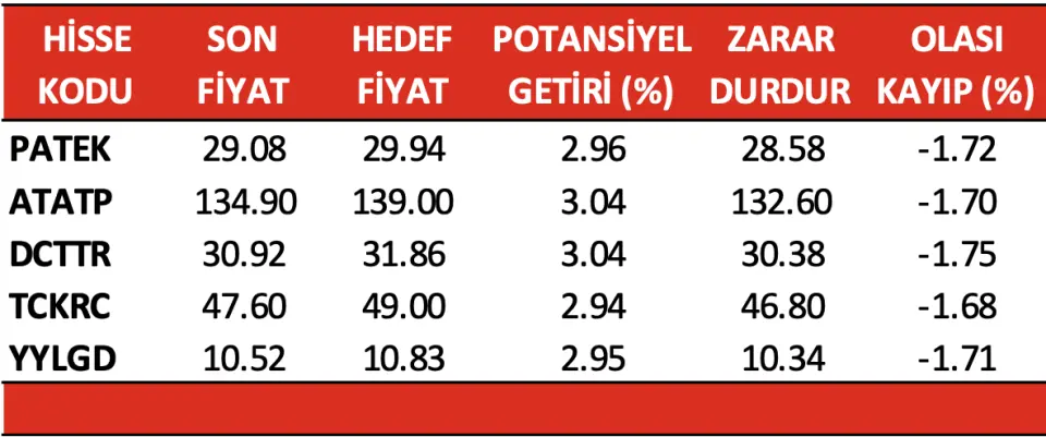 Alnus Yatırım, bugün PATEK, ATATP, DCTTR, TCKRC ve YYLGD hisseleri için hedef fiyat verdi. BİST 100 endeksini değerlendiren Alnus, piyasa beklentilerini de açıkladı.