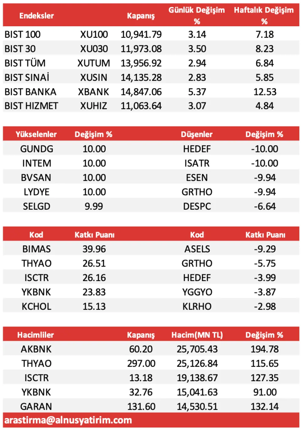 - "Geçtiğimiz haftanın son işlem gününe BİST-100 endeksi; 91,57 puanlık yükselişle başladı. Öğlene doğru iç taraftan gelen olumlu bir haber akışının etkisiyle Bankacılık Endeksi şirketleri önderliğinde yükseliş hareketleri hızlanırken; yukarı tarafta 11.158,05 seviyesi test edildi. Seansın sonunu ise; günün zirvesinden oluşan geri çekilme sonrasında, yüzde 3,14 oranındaki güçlü yükselişle 10.941,79 puandan noktaladık. Endeksin işlem hacmi; önceki güne göre 107,2 Milyar TL civarındaki oldukça güçlü artışla, 260,1 Milyar TL ile tüm zamanların en yüksek düzeyinde gerçekleşti. BİST 100 endeksine puan bazında en fazla pozitif etki eden şirket hisseleri ise; 39,96 puan ile BIMAS, 26,51 puan ile THYAO ve 26,16 puan ile ISCTR oldu."