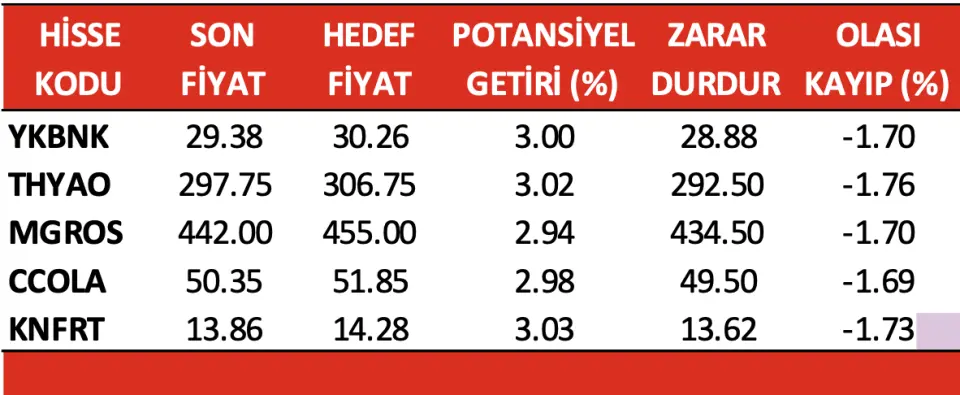 Alnus Yatırım bugün YKBNK, THYAO, MGROS, CCOLA ve KNFRT hissesine yönelik hedef fiyat verirken potansiyel getirileri de açıkladı. BİST 100 endeksi değerlendirmesi de öne çıktı.