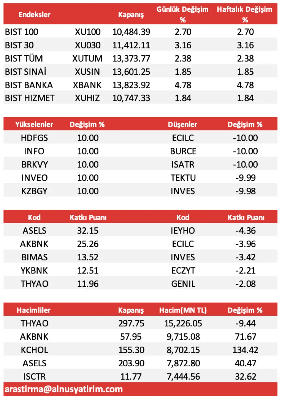 - "Yeni haftanın ilk işlem gününe BİST-100 endeksi; 38,51 puanlık yükselişle başladı. Erken saatlerde 10.109,02 puan seviyesine kadar gerileyen endekste, TCMB/ PPK toplantısına ve duyurulacak olan finansal raporlara ilişkin öngörülerle; Bankacılık endeksi önderliğinde başlayan yukarı yönlü atakların gün içerisinde ivme kazanmasıyla, 10.522,63 puan seviyesine kadar yükseliş gördük. Seansın sonunu; yüzde 2,70 oranındaki güçlü yükselişle 10.484,39 puandan noktalayan endeksin, işlem hacmi de; önceki güne göre 17,2 Milyar TL civarındaki artışla, 146,5 Milyar TL civarında gerçekleşti. BİST 100 endeksine puan bazında en çok pozitif etki eden şirket hisseleri ise; 32,15 puan ile ASELS, 25,26 puan ile AKBNK ve 13,52 puan ile BIMAS olarak karşımıza çıktı."