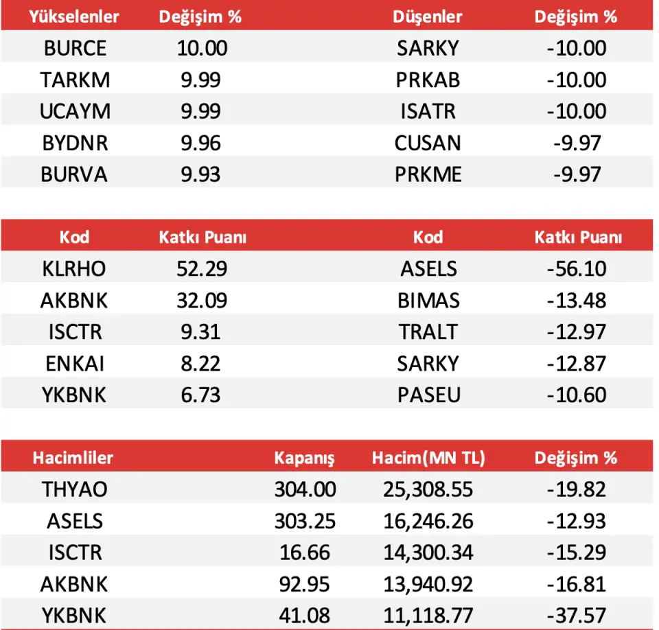 Geçtiğimiz haftanın son işlem gününe; BİST 100 endeksinin 21,71 puanlık düşüşle başladığı hatırlatıldı. Gün içerisinde 13.649,11 puana kadar düşen endekste, akabinde oluşan toparlanma hareketleriyle seansın sonunu ise; yüzde 0,05 oranında sınırlı artışla 13.838,29 puandan, tarihi kapanış rekoru ile tamamlamanın yapıldığı ifade edildi. İşlem hacmi ise;önceki günkü 302,5 Milyar TL’lik rekor düzeyden 244,1 Milyar TL’ye düştü. Puan bazında endekse en çok pozitif katkı sağlayan şirket hisseleri; 52,29 puan ile KLRHO, 32,09 puan ile AKBNK ve 9,31 puan ile ISCTR olarak açıklandı. Baskıya sebep olan şirket hisselerinin ise; 56,10 puan ile ASELS, 13,48 puan ile BIMAS ve 12.97 puan ile TRALT olduğu duyuruldu.