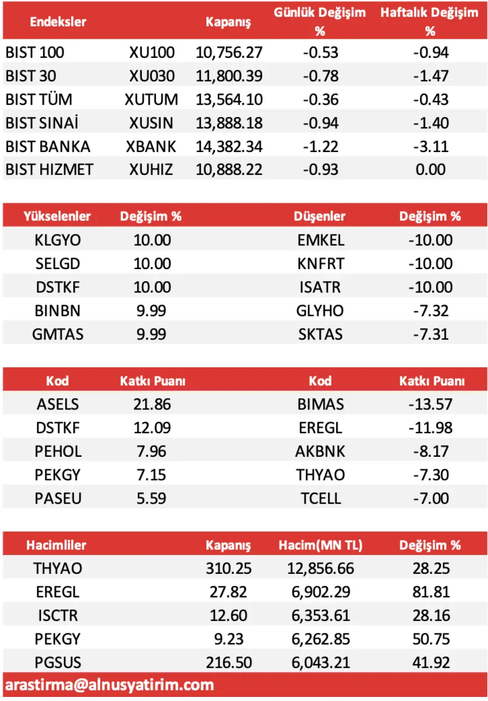 - "Dünkü işlem gününe BİST-100 endeksi, 26,63 puanlık düşüşle başladı. Gün içerişimde dalgalı bir seyir gördüğümüz ulusal-100 endeksinde, kapanışa doğru satış ağırlıklı işlemlerin ön plana çıkmasıyla; yüzde 0,53 oranındaki düşüşle, 10.756,27 puandan seansı noktaladık. BİST 100 endeksinin işlem hacmi ise; geçtiğimiz güne oranla 18,9 Milyar TL civarındaki yükseliş ile 136,1 Milyar TL civarında gerçekleşti. Endekse puan bazında en fazla negatif etki eden şirket hisseleri; 13,57 puan ile BIMAS, 11,98 puan ile EREGL ve 8,17 puan ile AKBNK olarak karşımıza çıktı."