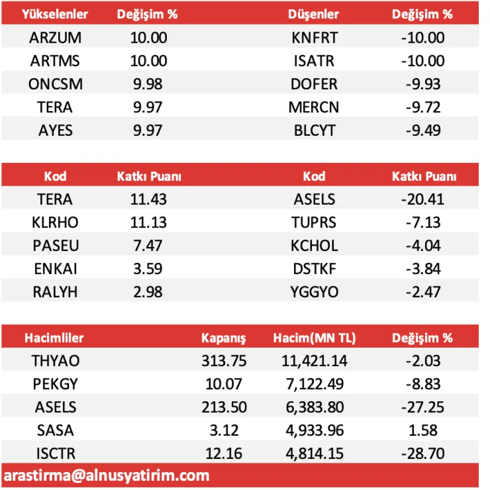 - "BİST-100 endeksi, önceki haftanın son işlem gününe; 10,93 puanlık sınırlı artışla başladı. Gün içerisinde dalgalı bir seyir izleyen ulusal-100 endeksinde, kapanışı da; sadece yüzde 0,06 oranındaki düşüşle, 10.720,36 puandan tamamladık. BİST 100 endeksinin işlem hacmi; önceki güne göre 14,9 Milyar TL civarındaki düşüşle 105,6 Milyar TL civarında gerçekleşti. Endekse puan bazında en fazla negatif etki eden şirket hisseleri ise; 20,41 puan ile ASELS, 7,13 puan ile TUPRS ve 4,04 puan ile KCHOL olarak karşımıza çıktı."