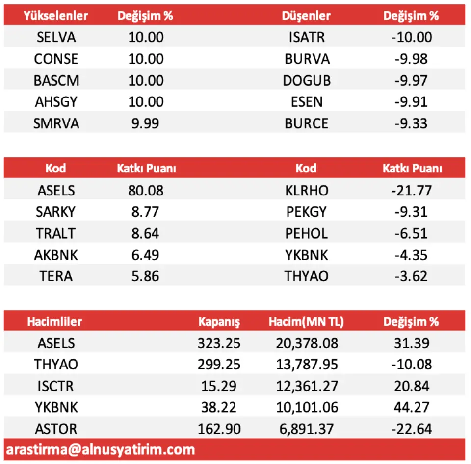 - "Endeks, seansın sonunu; yüzde 1,42 oranında yükselişle 13.177,32 puandan tamamlayarak kapanış rekorunu da tazelemiş oldu. İşlem hacmi ise; önceki günkü 181,6 Milyar TL düzeyinden, 192,4 Milyar TL’ye yükseldi. Puan bazında endekse en fazla pozitif etki eden şirket hisseleri; 80,08 puan ile ASELS, 8,77 puan ile SARKY ve 8,64 puan ile TRALT oldu."