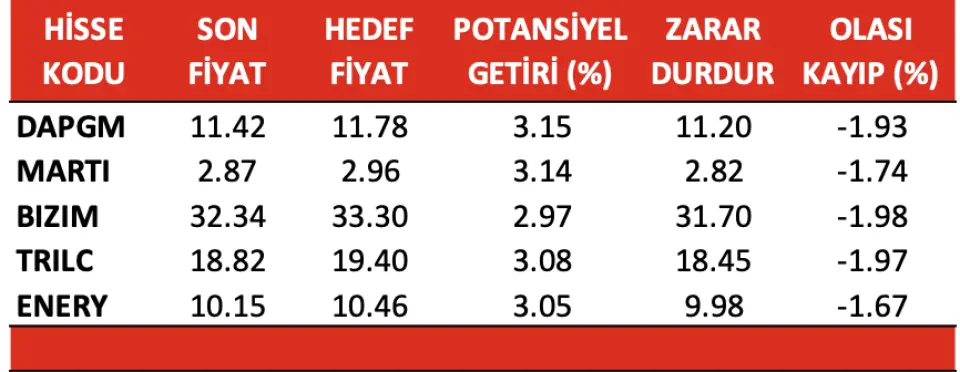 Alnus Yatırım'ın hisse tavsiyeleri arasında DAPGM, MARTI, BIZIM, TRILC ve ENERY yer aldı. Hisselere ait son ve hedef fiyat açıklanırken potansiyel getiri, zarar durdur ve olası kayıp verileri de açıklandı.