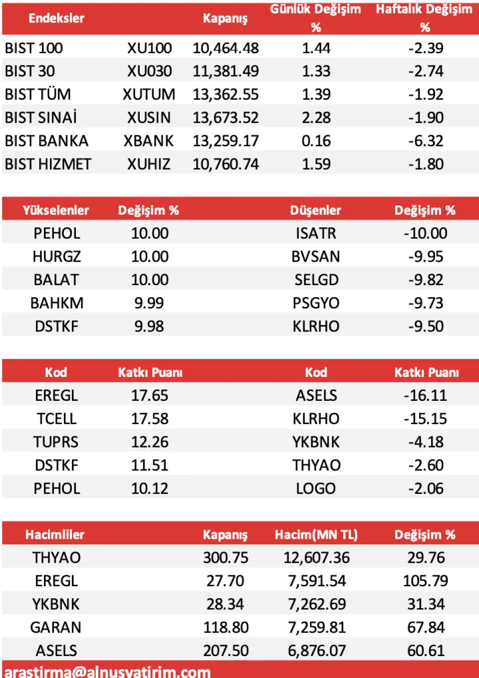 - "Seansın sonunu; yüzde 1,44 oranındaki yükselişle 10.464,48 puandan noktalayan endeksin, işlem hacmi de; önceki güne göre 17,4 Milyar TL civarındaki artışla, 134,6 Milyar TL civarında gerçekleşti. Endekse puan bazında en fazla pozitif etki eden şirket hisseleri ise; 17,65 puan ile EREGL, 17,58 puan ile TCELL ve 12,26 puan ile TUPRS olarak karşımıza çıktı."